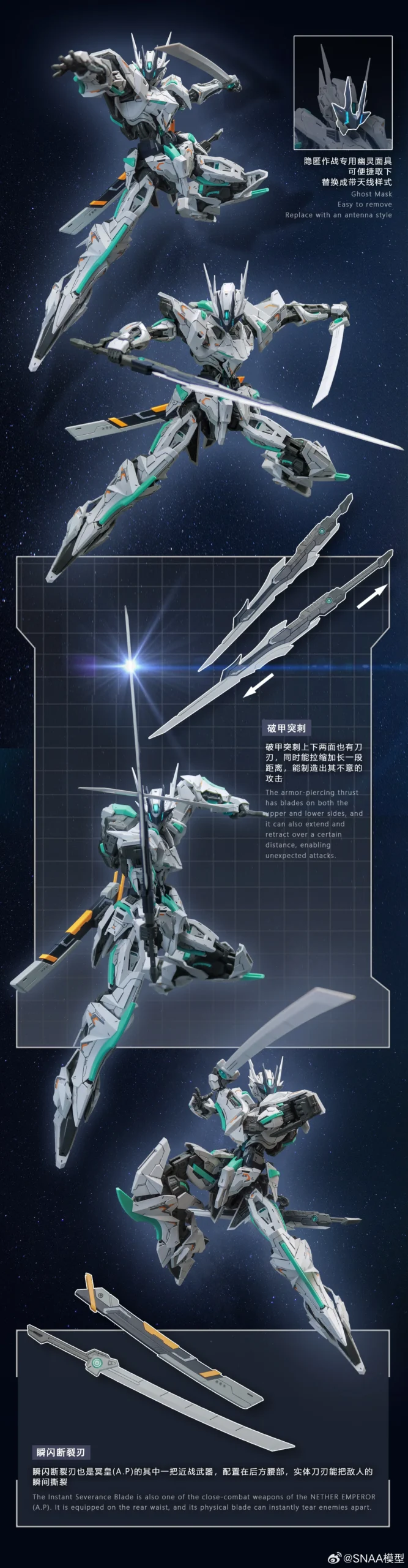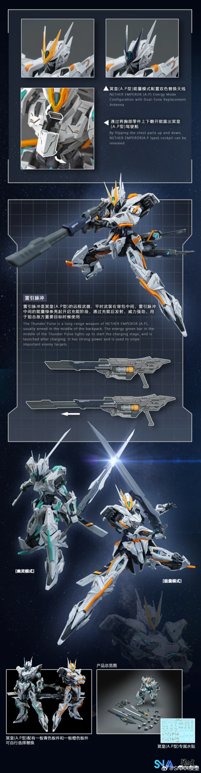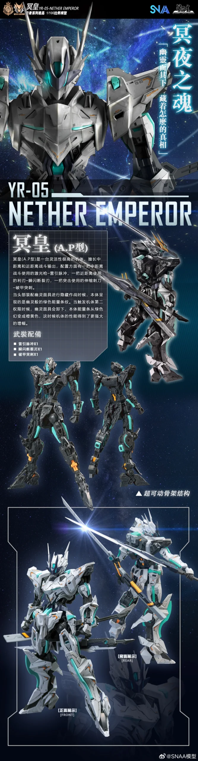 SNAA Nether Emperor (A.P Type) YR-05 is a 1/100 scale high-mobility mecha kit from SNAA’s Emperor lineup, standing at around 22cm once built. It’s designed as a fast, mid-to-close-range unit with a full inner frame and layered armour that’s engineered to keep articulation clear—so you can hit aggressive lunges, wide slashes, and evasive “in-motion” poses without the plating constantly getting in the way.