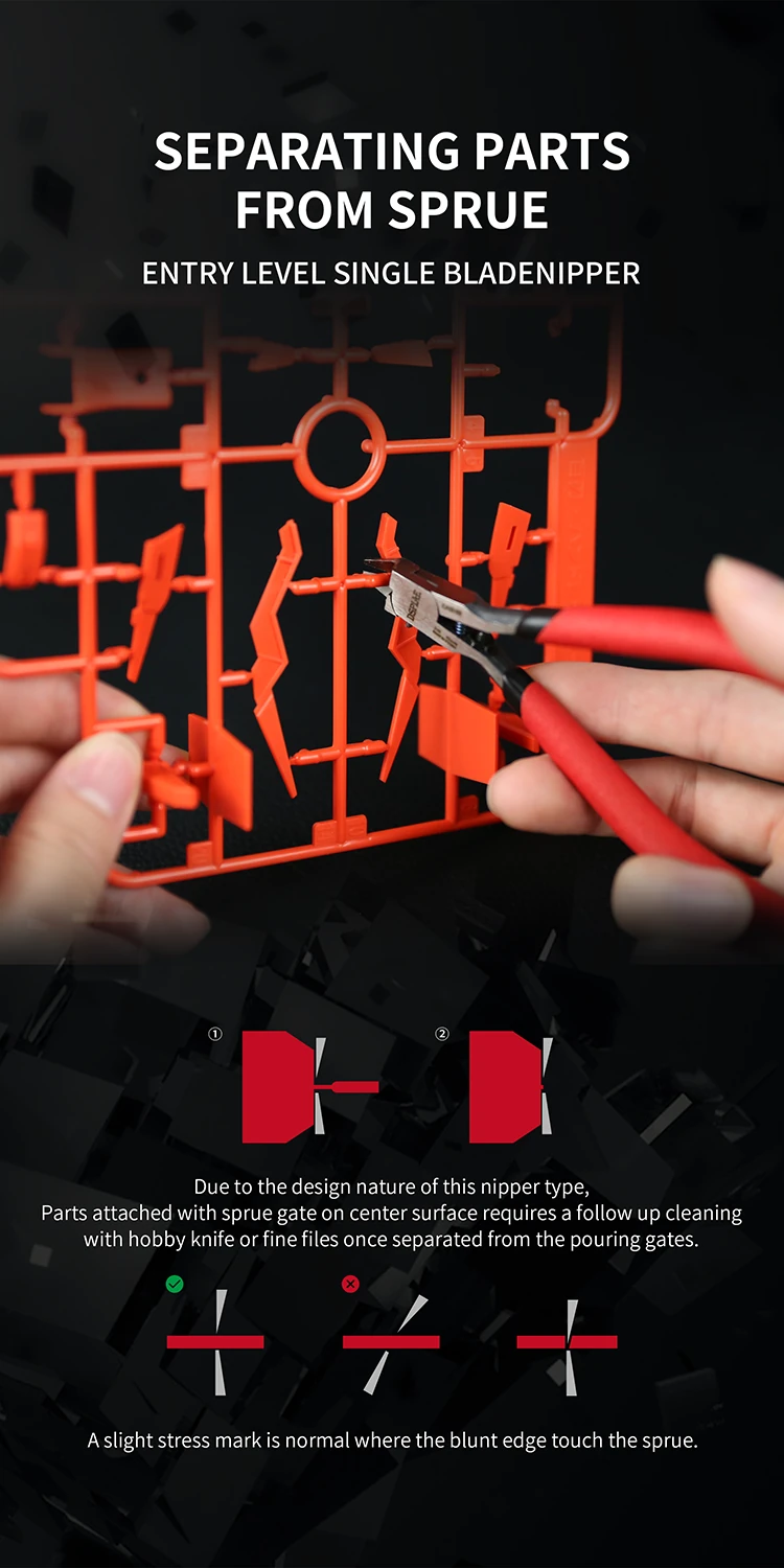 The included nipper is ideal for general sprue cutting; for the cleanest “finish cut,” many builders still use a dedicated ultra-fine single-blade nipper as an upgrade later.