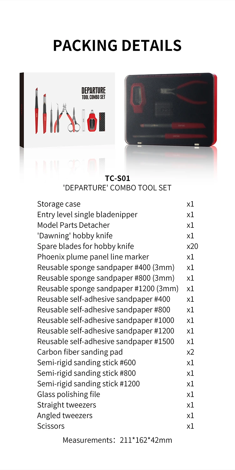 DSPIAE TC-S01 “Departure” Tool Combo Set is an all-in-one starter toolkit for Gunpla and plastic model building. It covers the essential steps—cutting parts from runners, separating tight assemblies, cleaning gates, sanding/polishing, and handling decals/small parts—and packs everything into a dedicated storage box for easy organisation at home or on the go.