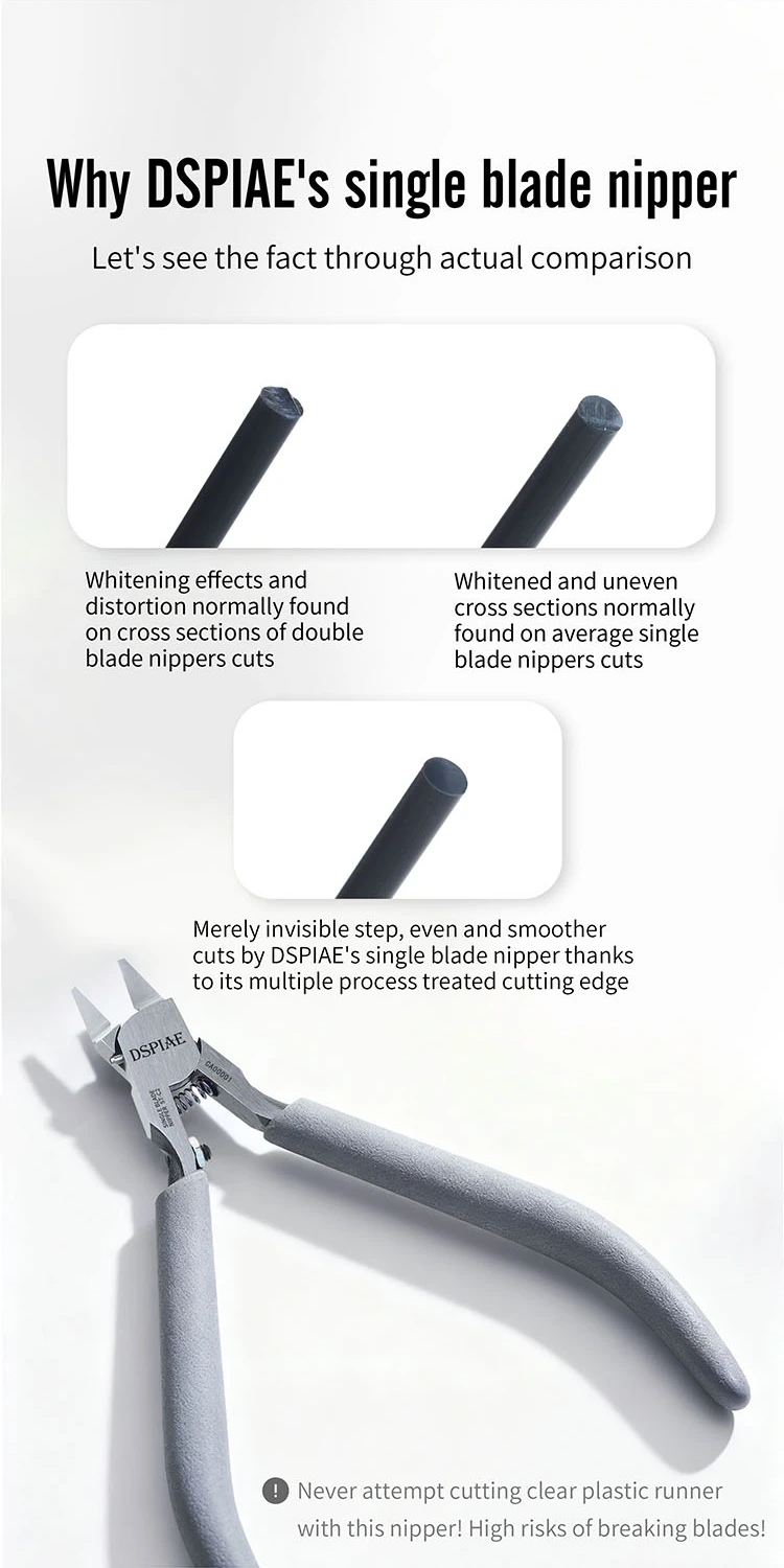 DSPIAE ST-C2 Ultra Thin Single Blade Hobby Nipper is an entry-level, high-precision single-blade nipper designed for clean sprue gate removal with reduced stress marks on plastic parts. The ultra-thin, mirror-polished cutting edge helps deliver a smooth slicing cut, while the ergonomic grip and spring return keep it comfortable for long build sessions.
