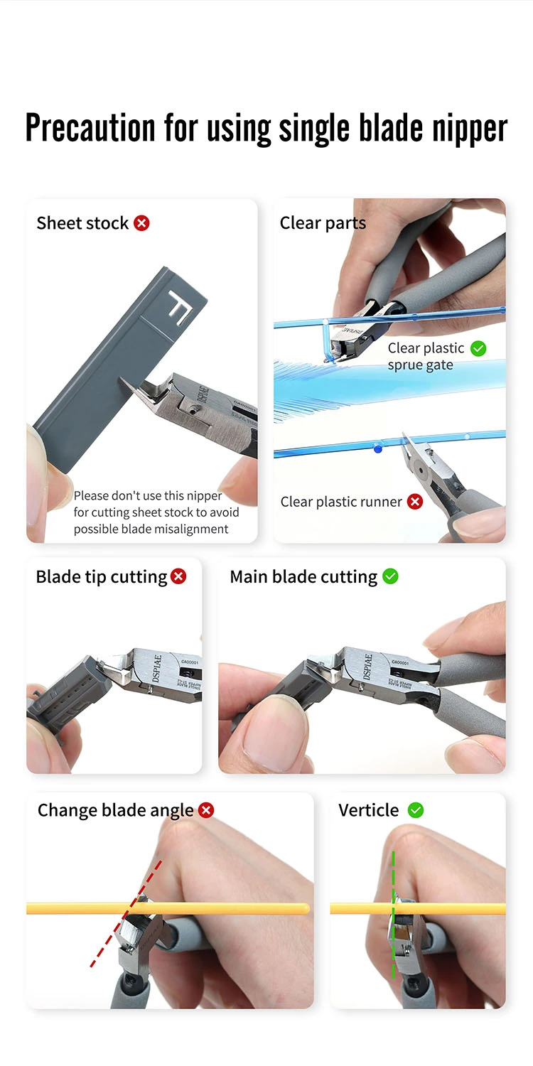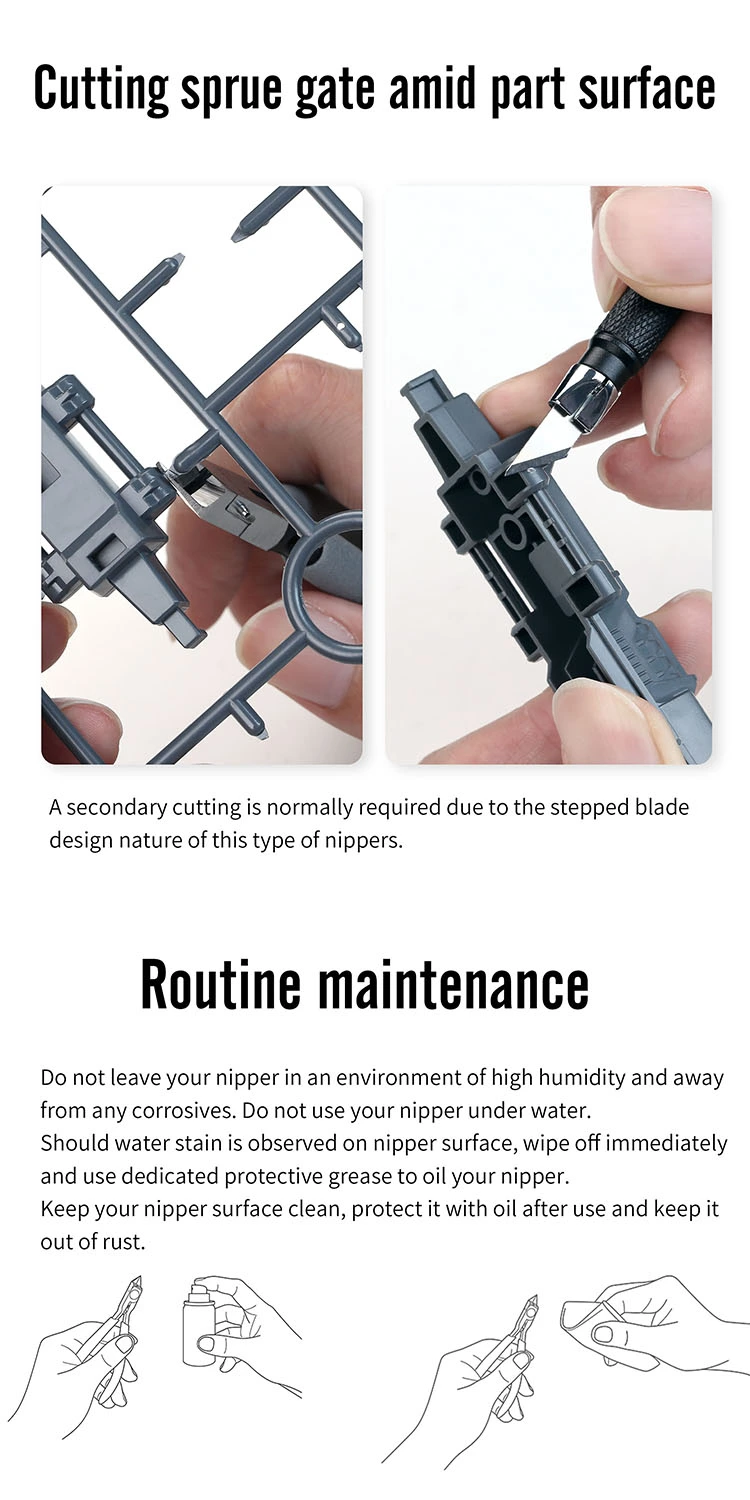 - Avoid cutting hard materials (e.g., resin, metal wire) and don’t force thick runners—use a rough cut first if needed.