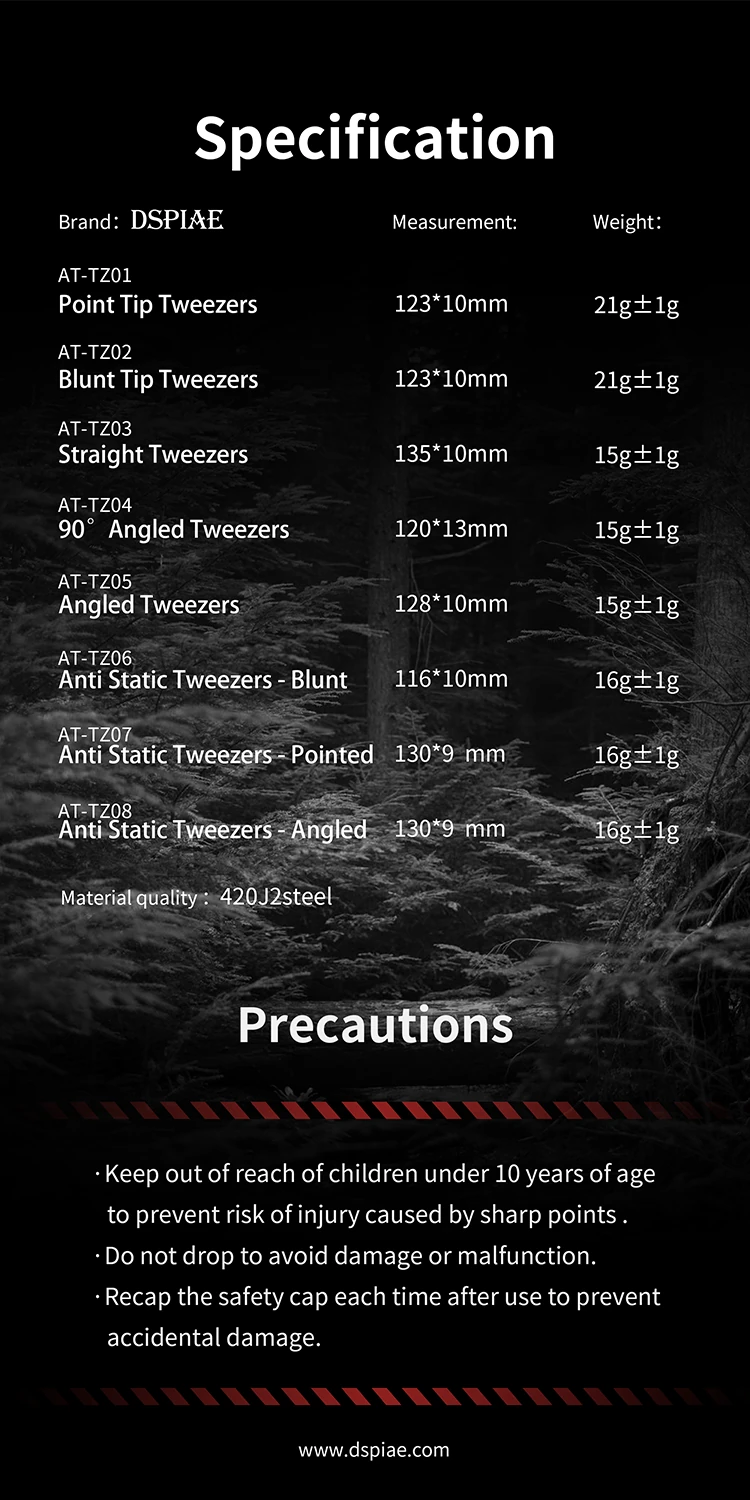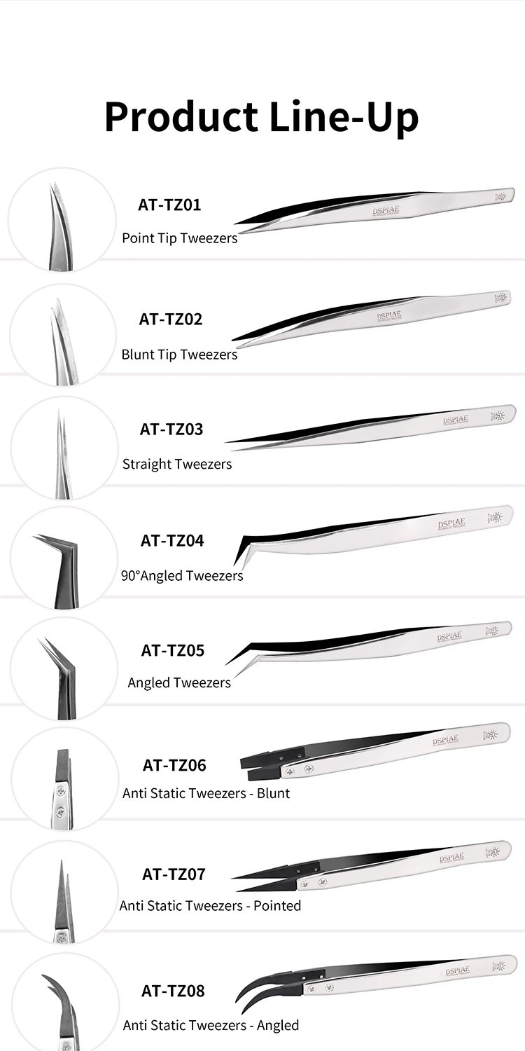 The AT-TZ series includes multiple tip styles so you can choose the best shape for the job—whether you need maximum visibility for decal placement, a flat tip for gripping, or angled heads for reaching into tight spaces. Selected versions also offer anti-static performance to reduce static cling when working with light films and tiny parts.